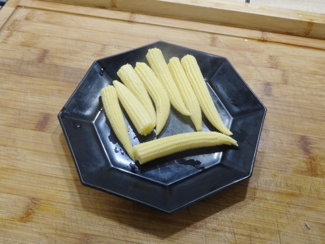 4- Dans la même poêle, faire sauter les rondelles de carottes pendant une minute, puis le brocoli pendant encore une minute, le champignon noir tranché pendant 30 secondes puis enfin le maïs nain - il suffit de le réchauffer. Bien remuer pendant deux minutes, enlever de la poêle, et réserver au chaud avec les crevettes.