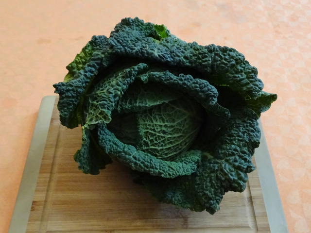 Enlever les premières feuilles du chou frisé. Couper légèrement le trognon, mais le laisser pour éviter de perdre toutes les feuilles dans le bouillon. Couper le chou en 3 ou 4 grosses lamelles, en les laissant attachées au trognon.