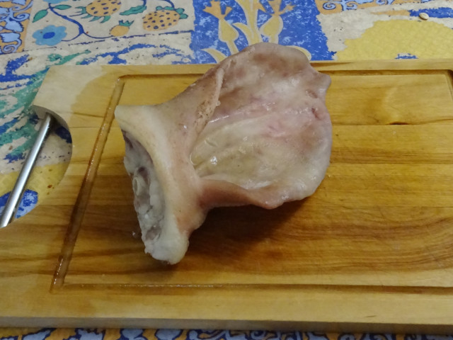 1- Après avoir éventuellement enlevé la gelée, avec un couteau bien aiguisé, couper l'oreille en lanière assez fine, de la pointe vers la base.