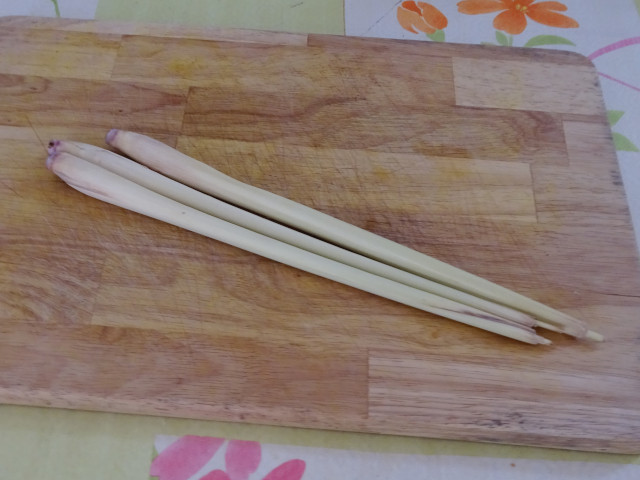 1- La citronnelle n'étant pas un produit habituel, il convient de respecter quelques principes simples, notamment au moment de l'achat. Enlever les deux premières feuilles un peu coriace. Puis couper la tige de 6 à 7 cm du bulbe, la partie haute n'est pas utilisée dans le plat. Elle peut servir à parfumer des bouillons.