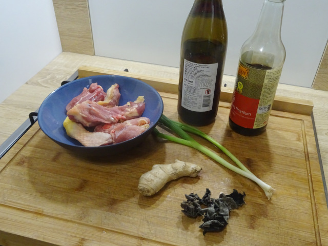 1- Faites tremper les champignons noirs dans de l'eau tiède. Couper les cuisses de poulet en "bouchées", enlever la peau.