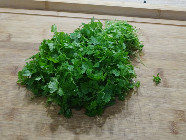 Laver la botte de cerfeuil. Prélever une vingtaine de brins. Bien éponger avec du papier absorbant. Éliminer les branches les plus dures au centre. Hacher grossièrement avec des ciseaux.