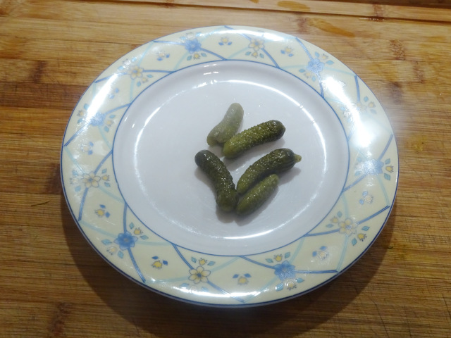 4- Éplucher puis émincer finement les échalotes. Couper 2 ou 3 cornichons en rondelles.