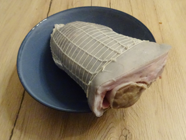5- Poser la tête de veau sur une planche. Enlever le filet élastique et couper des tranches épaisses de 3 cm d'épaisseur. Si la tête roulée contient un morceau de langue, penser à enlever la peau, c'est mieux pour vos invités.