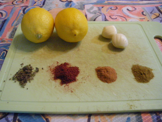 Mélanger le citron, l'huile, les épices et la purée d'ail. Saler un peu. Bien mélanger. C'est tout.