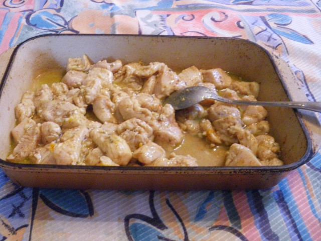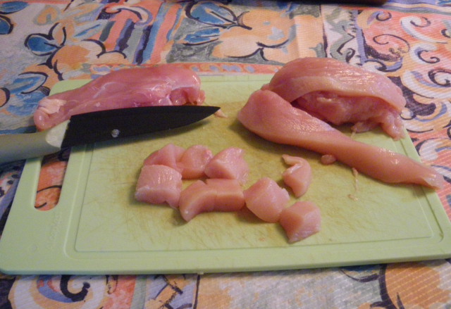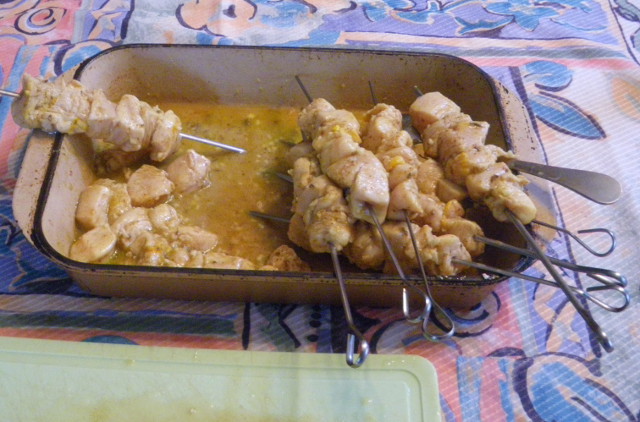 Préparer deux brochettes par personne. Enfiler les dés de poulet en les serrant bien.