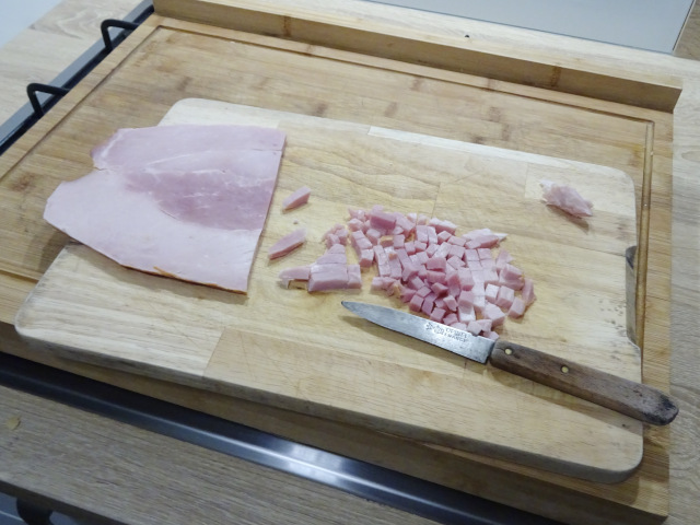 La tranche de jambon, les crêpes, le fromage râpé. Et les composants pour la béchamel, beurre, farine et lait.
