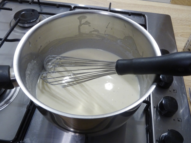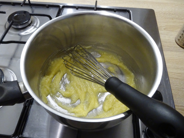 Faire fondre le beurre à feu doux dans une casserole. Ajouter la farine, mélanger au fouet. Cuire le mélange une trentaine de secondes toujours à feu doux.