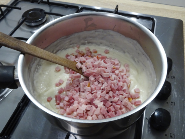 Les crêpes sont garnies d'une béchamel additionnée de petits morceaux de jambon et de fromage râpée – Comté ou Emmenthal. On peut aussi ajouter des lamelles de champignon de Paris cuits au beurre.