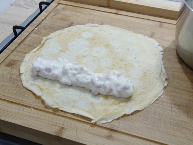 Déposer avec une cuillère le mélange de béchamel au jambon le long de la crêpe posée à plat. Il faut essayer d'avoir un cordon régulier, peu épais, pas vraiment au centre pour pouvoir la rouler facilement.