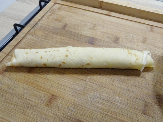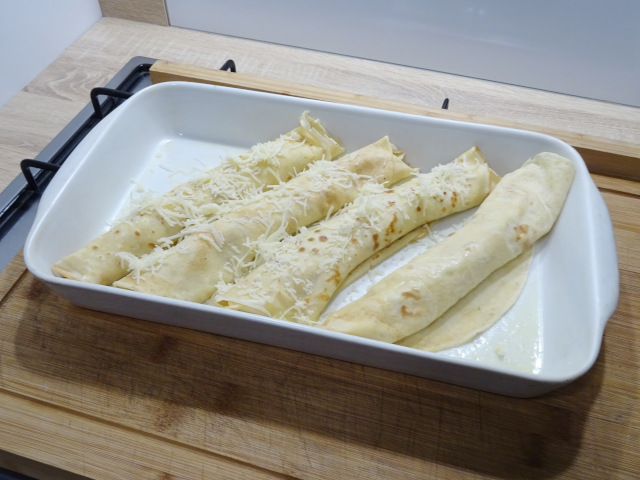Les crêpes sont roulées et placées dans un plat et saupoudrées de fromage râpé. Un passage au four d'une vingtaine de minutes terminent la préparation.