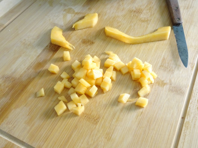 Découper un petit quartier en très petits cubes réguliers. On les utilisera pour la décoration.