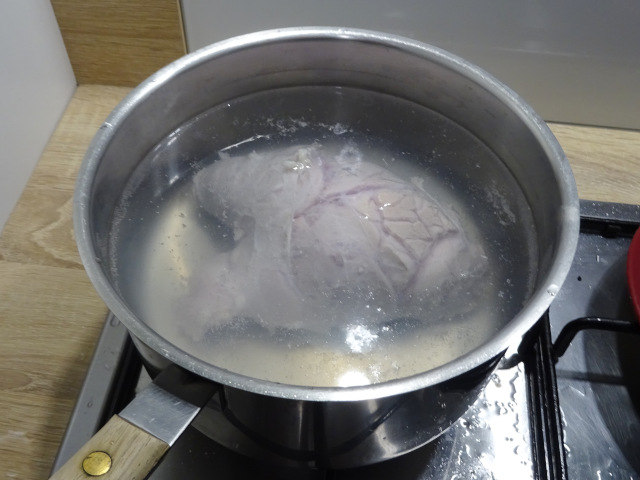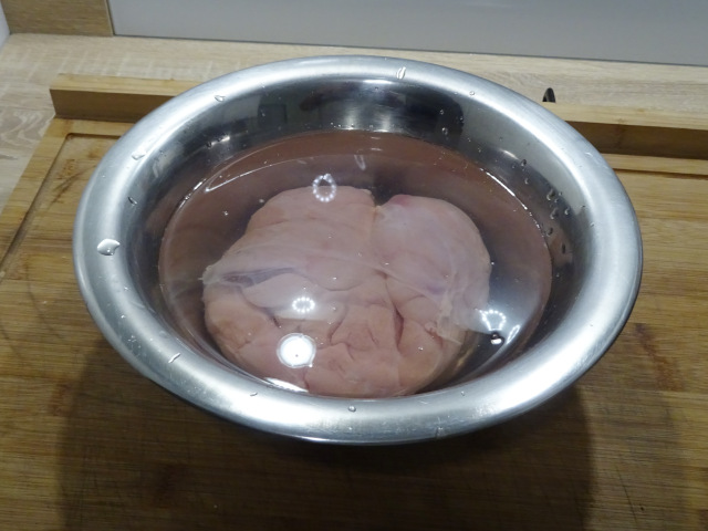 Cette étape a pour but d'enlever le sang à l'intérieur des lobes. Il suffit de le plonger dans de l'eau fraiche, additionnée de vinaigre.