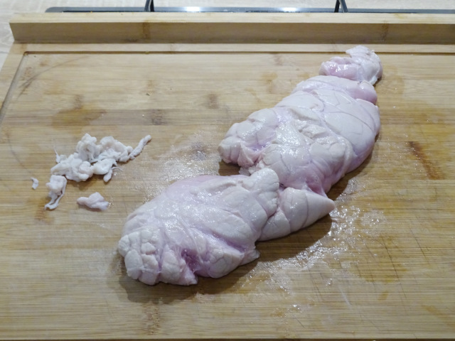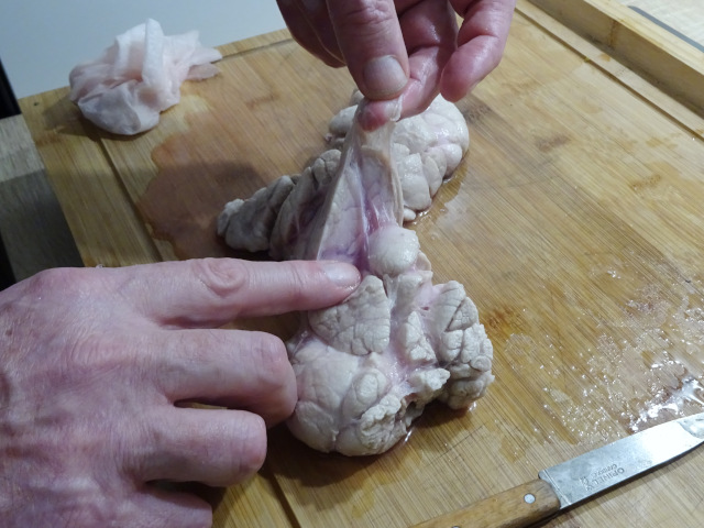 On continue à enlever les membranes, celles un peu plus en profondeur. Les membranes ont été raidies par le blanchiment, mais ça reste assez résistant. Il ne faut pas hésiter à ouvrir le ris et de séparer les différentes parties.