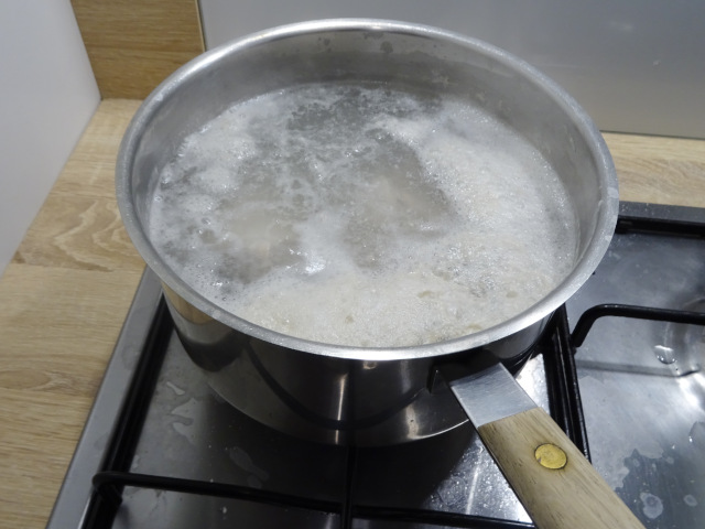 Mettre la casserole au bain marie, c'est à dire dans une casserole plus grande, remplie d'eau. Porter doucement à ébullition. Remuer régulièrement.