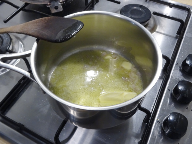 Faire fondre le beurre dans une petite casserole, ajouter une cuillère d'échalotes hachées. A très petit feu, faire suer l'échalote. Elle ne doit absolument pas colorée et le beurre ne doit pas grésiller. Remuer régulièrement avec une spatule ou un fouet et cuire l'échalote pendant cinq minutes.