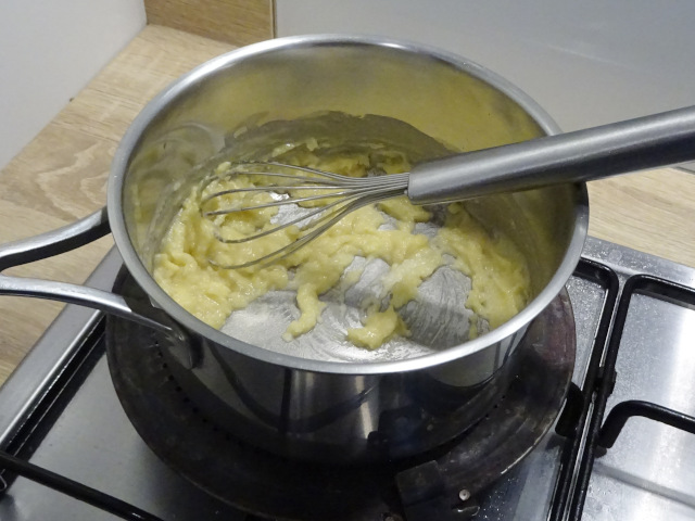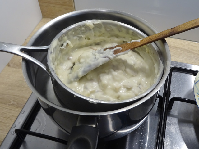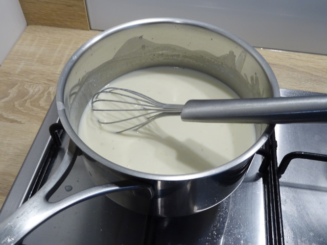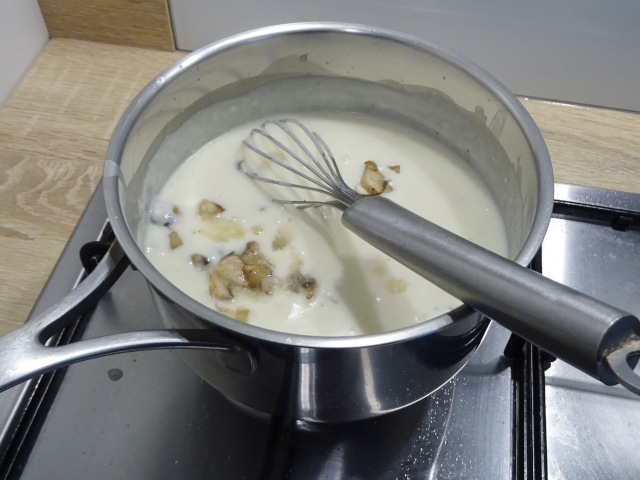 Ajouter peu à peu le lait comme pour une béchamel, en remuant assez vigoureusement pour éliminer les grumeaux. A la fin, saler, poivrer, ajouter la moitié du porto blanc, continuer la cuisson à petits feux.